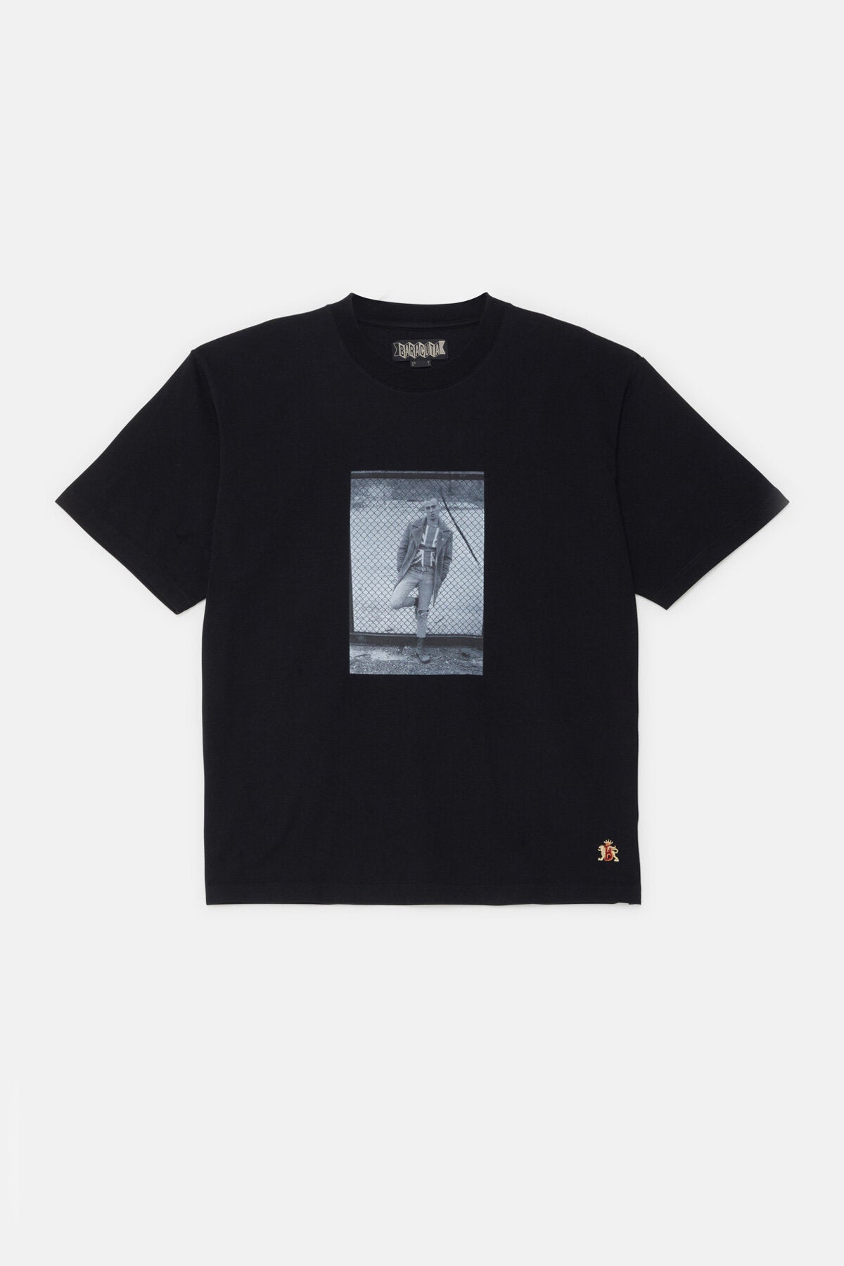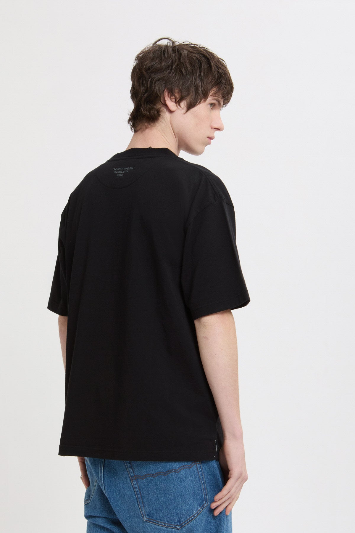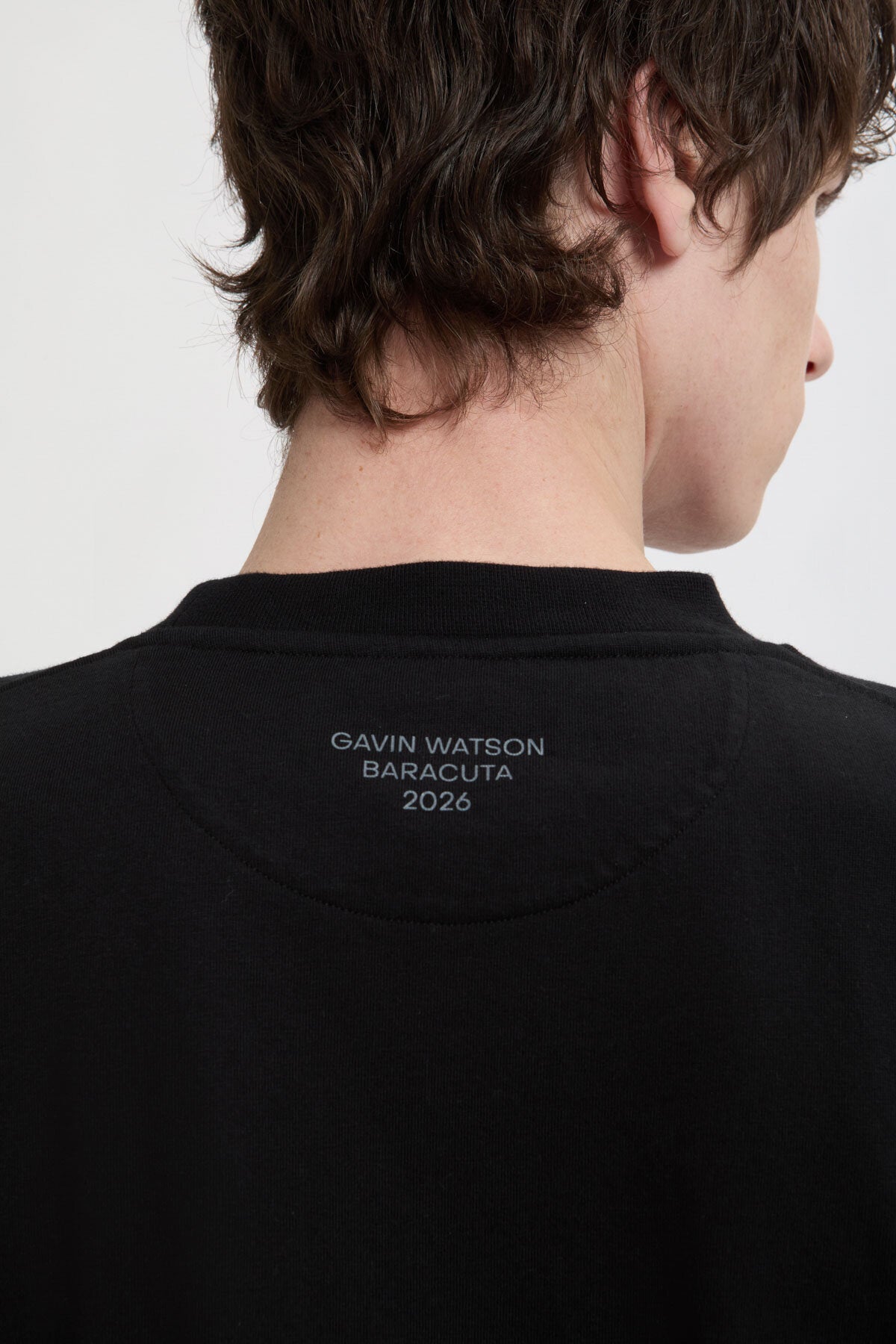 Le T-Shirt 1 Gavin Watson présente sa photographie sur un t-shirt à col ras du cou en 100 % coton, avec un imprimé saisissant sur la poitrine et le logo Baracuta brodé à côté. Au dos, « GAVIN WATSON BARACUTA SS26 » identifie la collaboration.