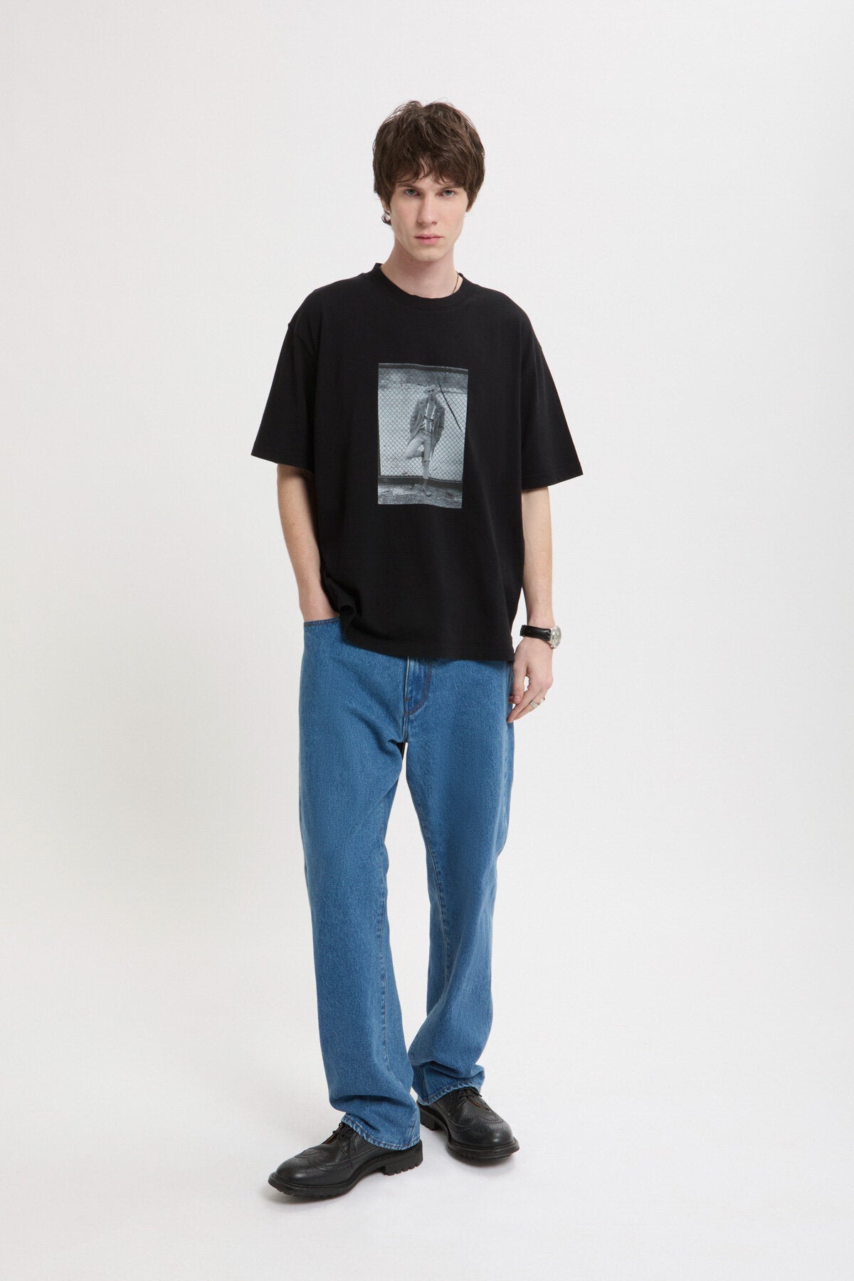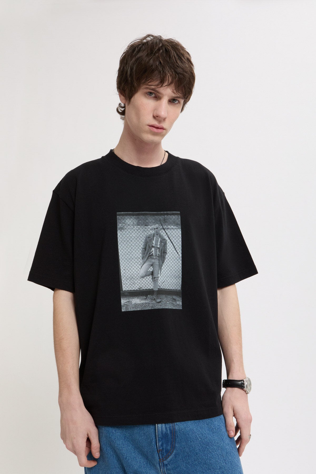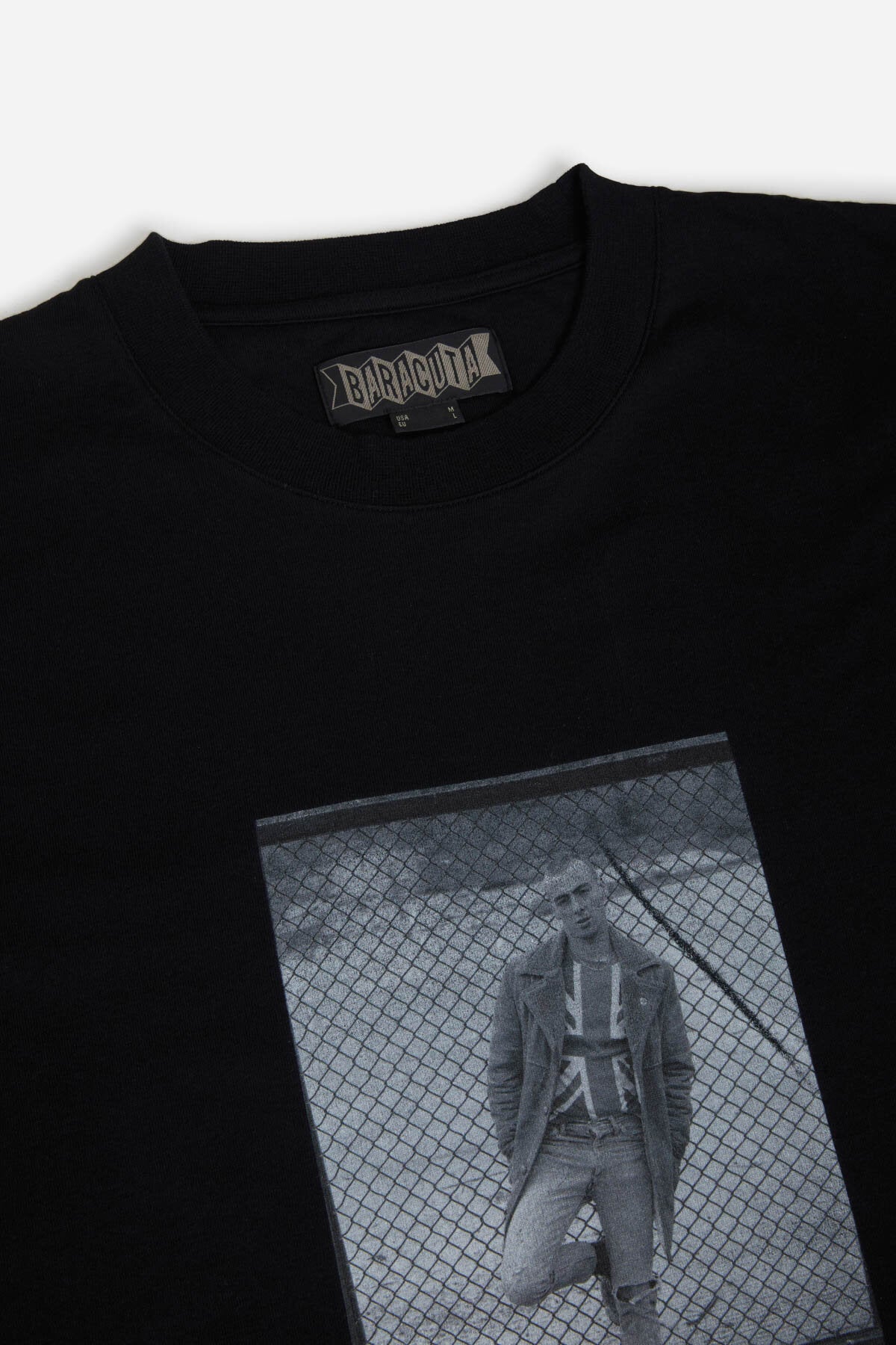 Le T-Shirt 1 Gavin Watson présente sa photographie sur un t-shirt à col ras du cou en 100 % coton, avec un imprimé saisissant sur la poitrine et le logo Baracuta brodé à côté. Au dos, « GAVIN WATSON BARACUTA SS26 » identifie la collaboration.