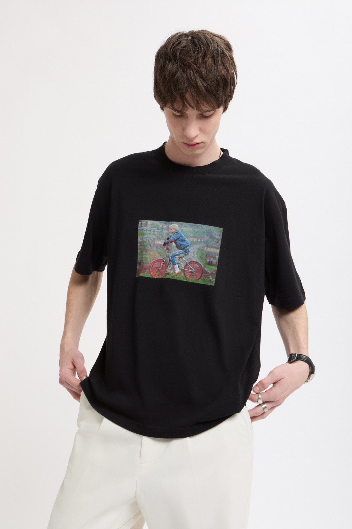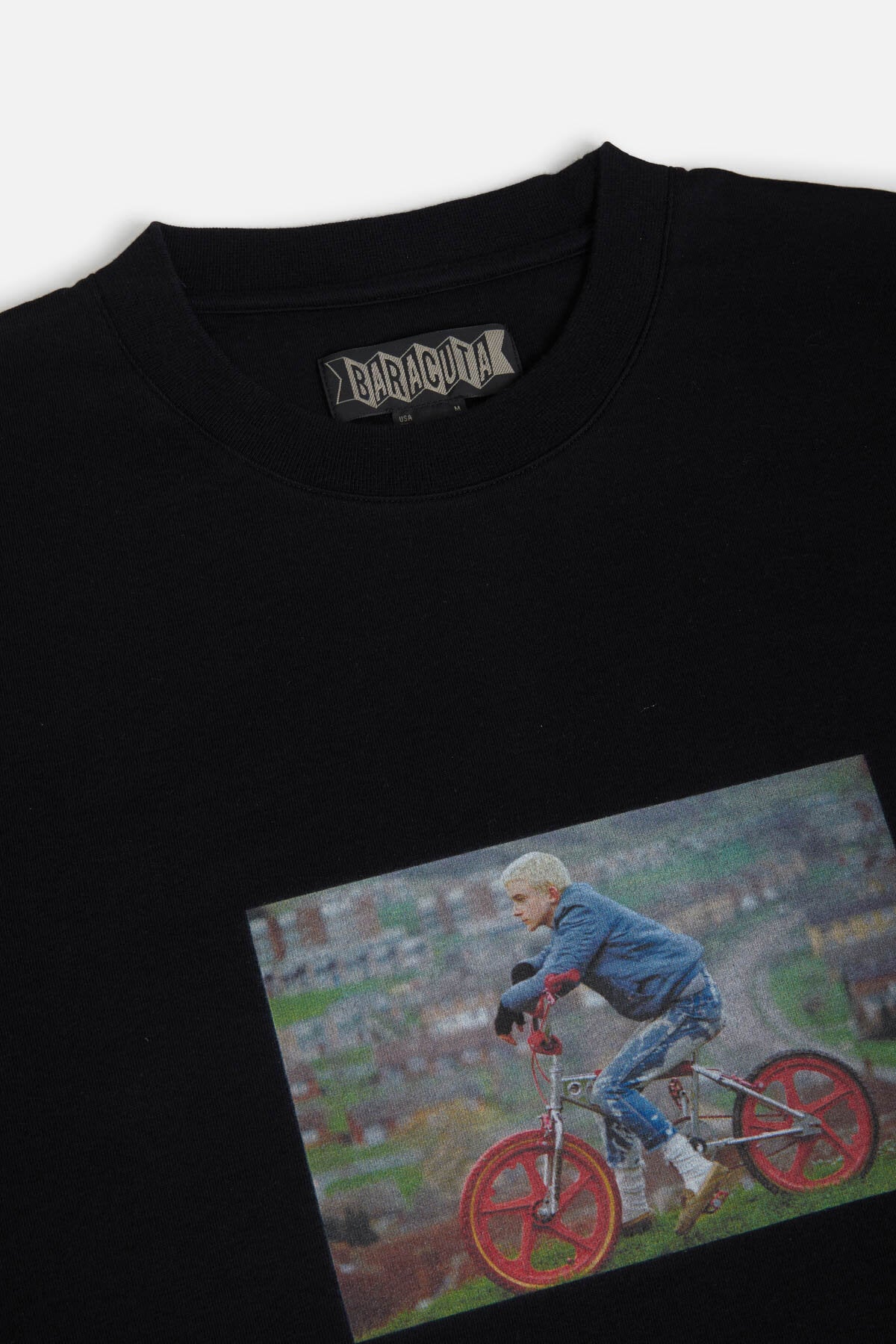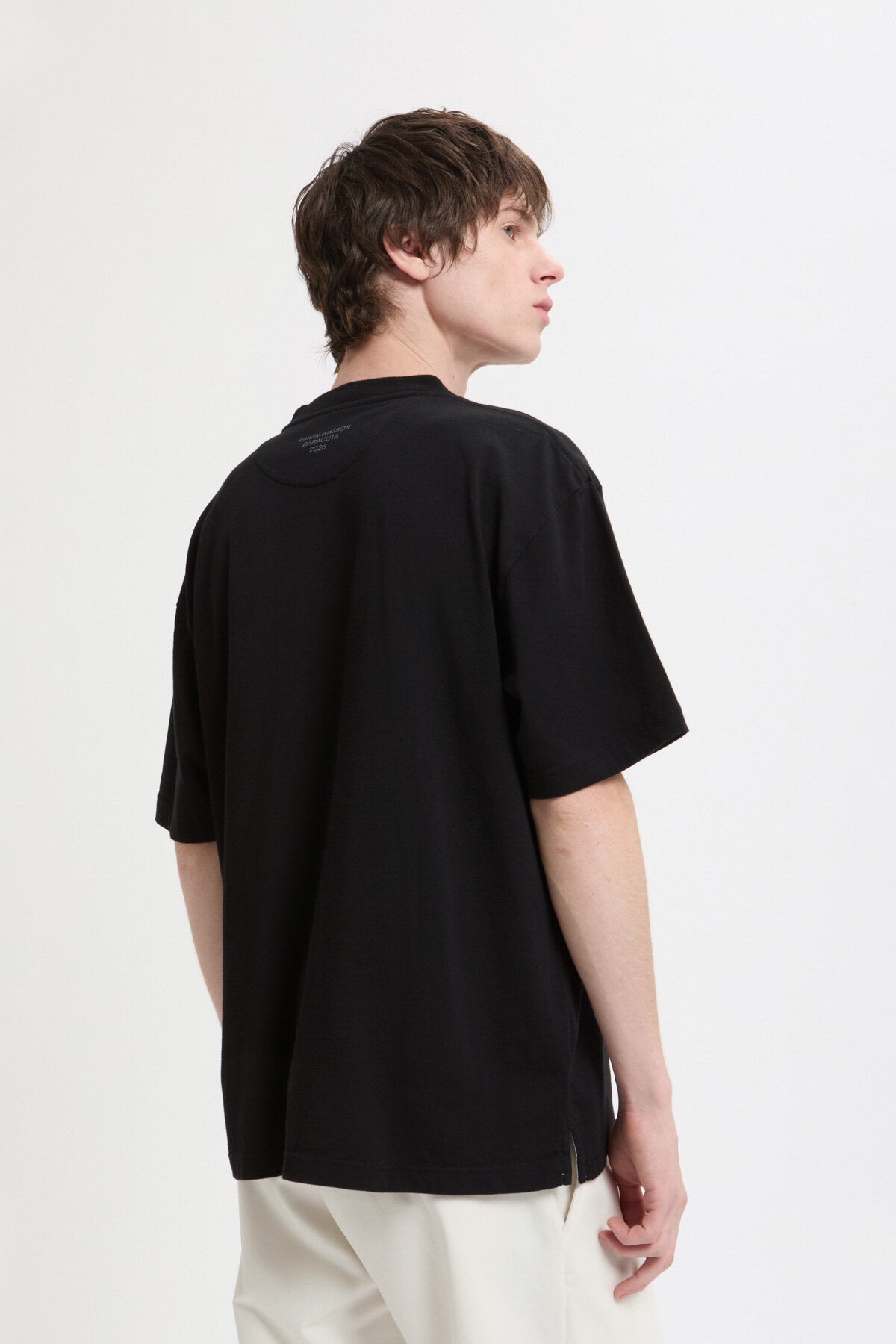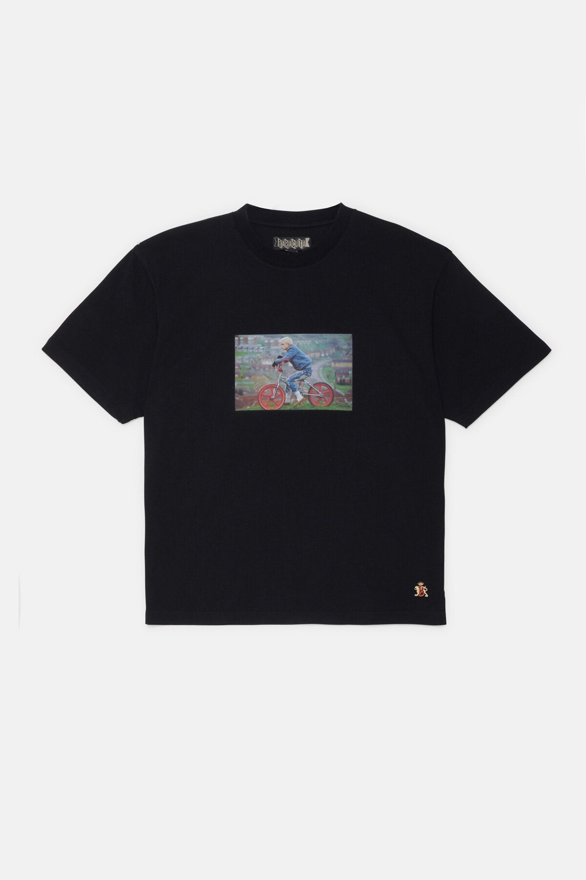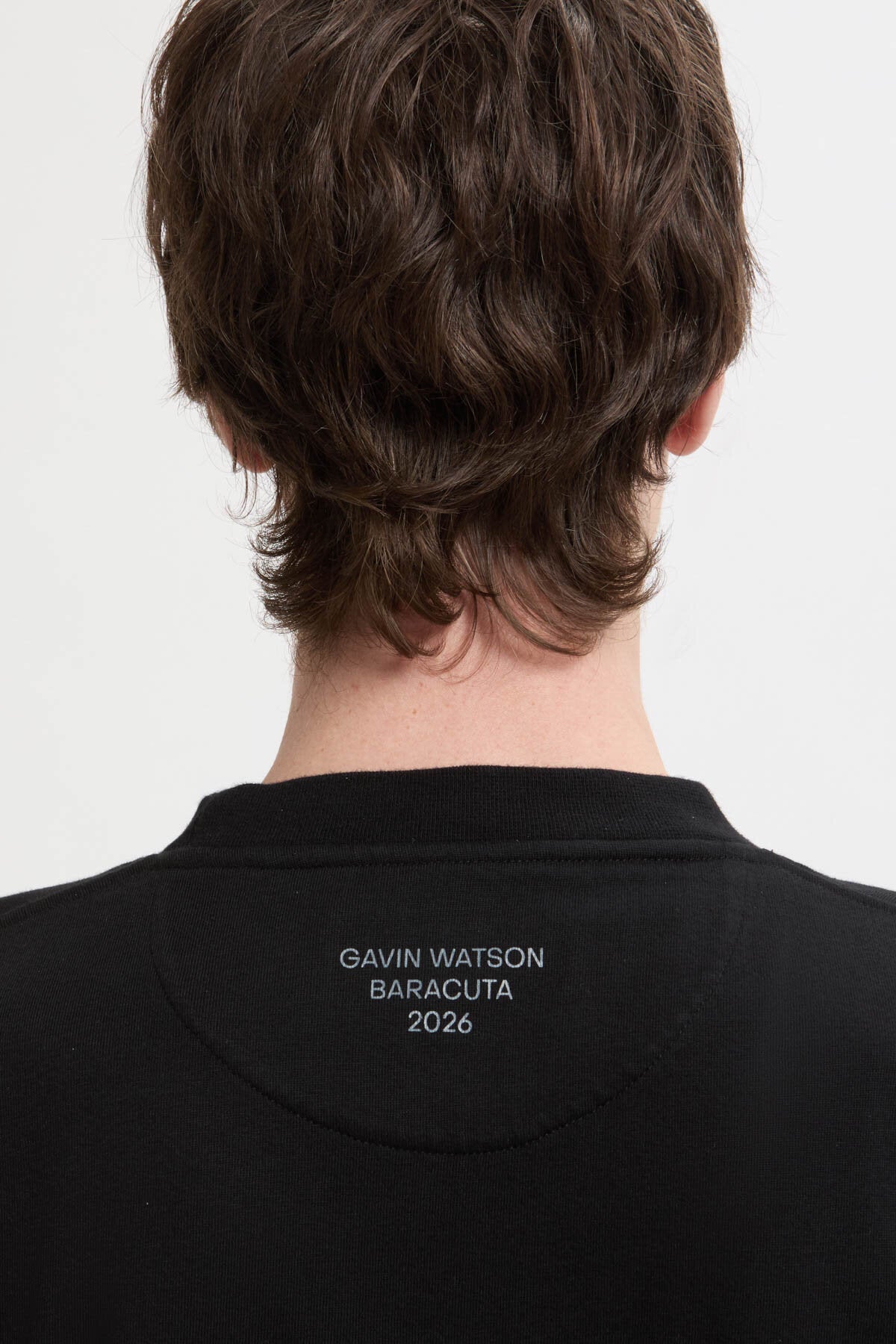 Le T-Shirt 2 Gavin Watson présente sa photographie sur un t-shirt à col ras du cou en 100 % coton, avec un imprimé saisissant sur la poitrine et le logo Baracuta brodé à côté. Au dos, « GAVIN WATSON BARACUTA SS26 » identifie la collaboration.