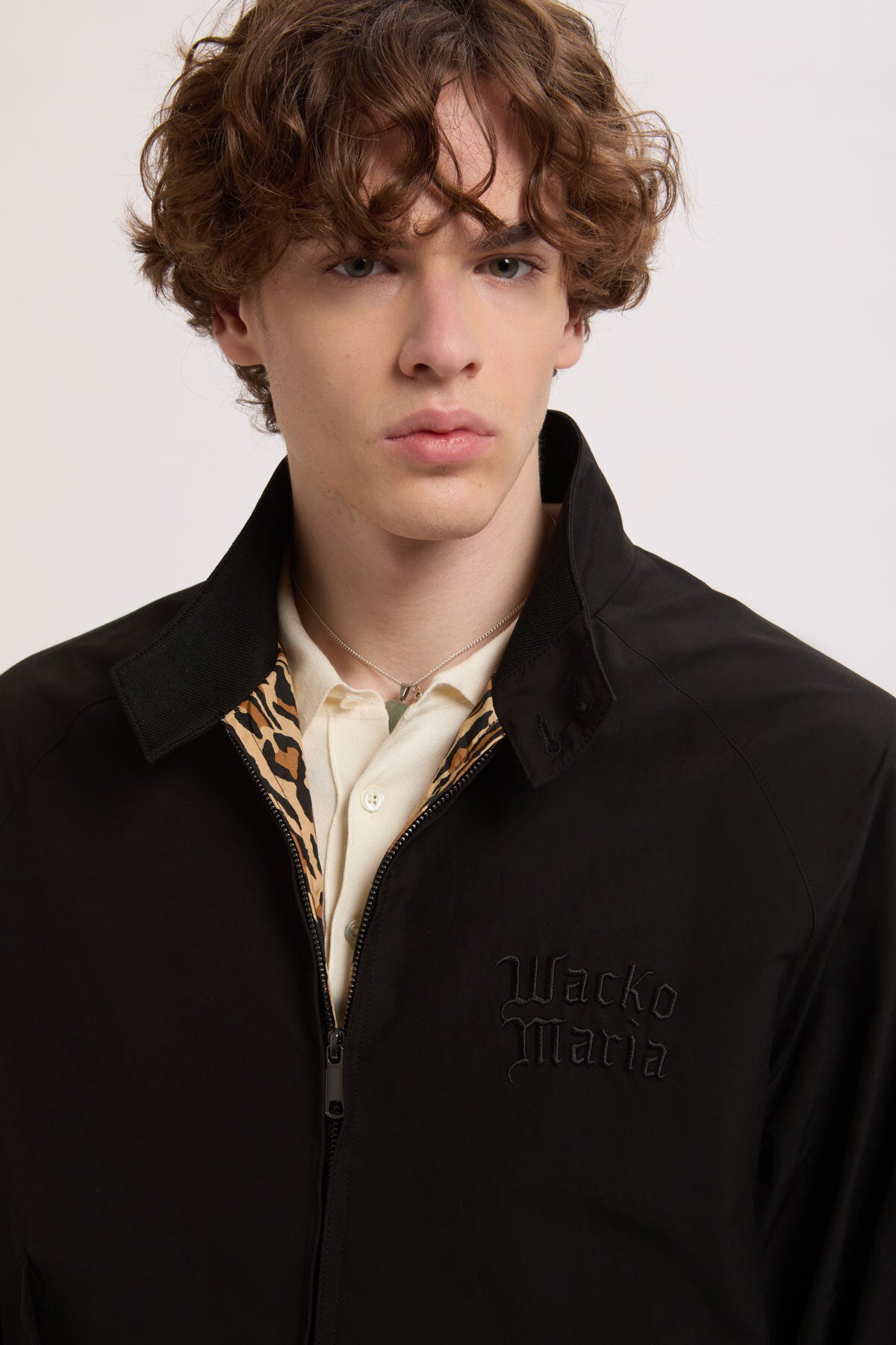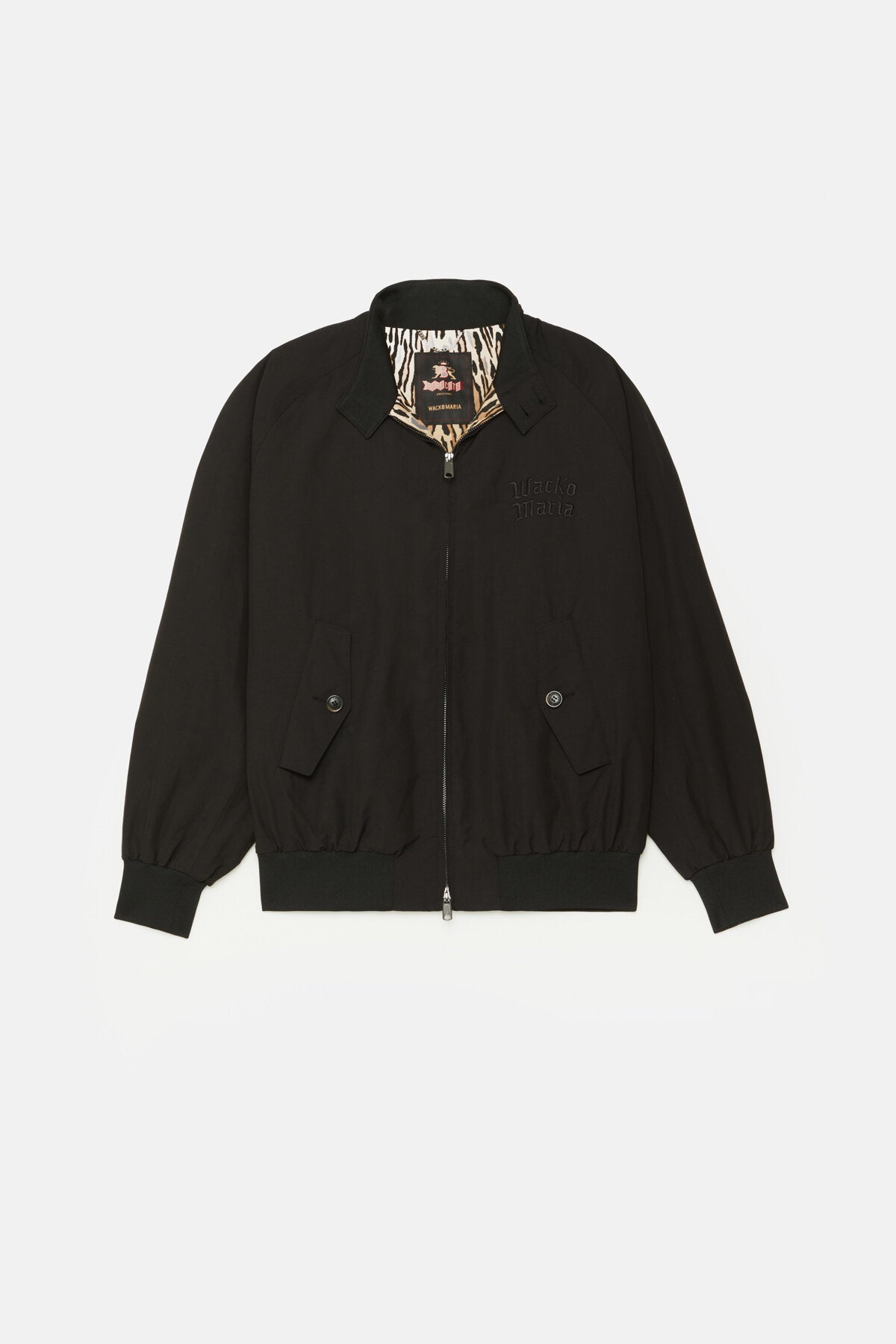 La veste conserve la construction emblématique de la G9, y compris l'empiècement dos en forme de parapluie, les manches raglan et le col montant côtelé à l'intérieur avec fermeture à deux boutons. La collaboration est marquée par la broderie « Wacko Maria » sur la poitrine, une chaîne de suspension en métal et une doublure à motif léopard qui contraste avec l'extérieur épuré. Disponible dans les coloris noir et Andorre.