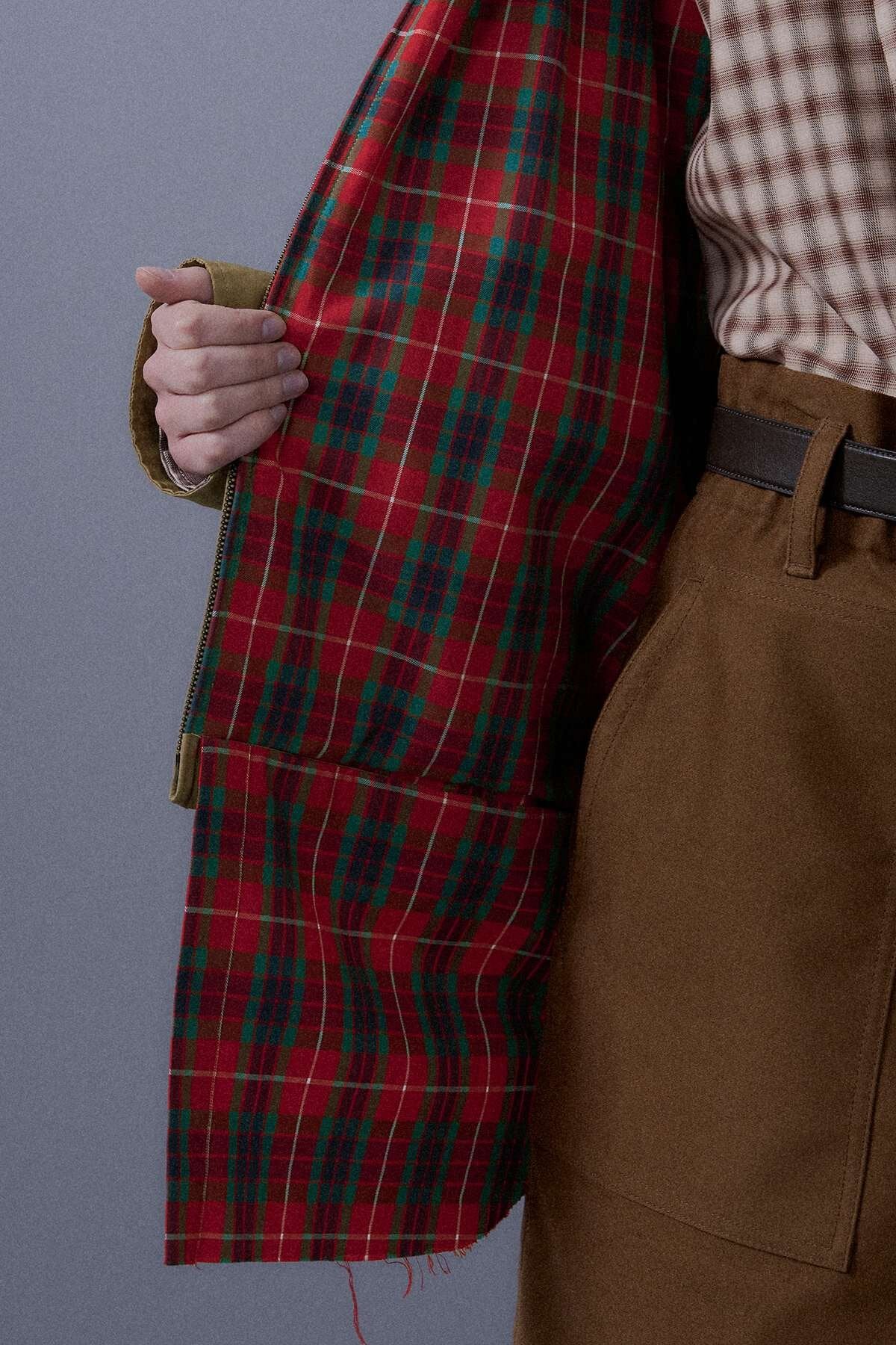 It’s got all the signature details: umbrella back yoke, dog ear collar with double-button closure, and Fraser Tartan lining. The standout? The lining extends below the hem, giving the feel of a checked shirt layered underneath, a quiet nod to System’s knack for clever, everyday layering.