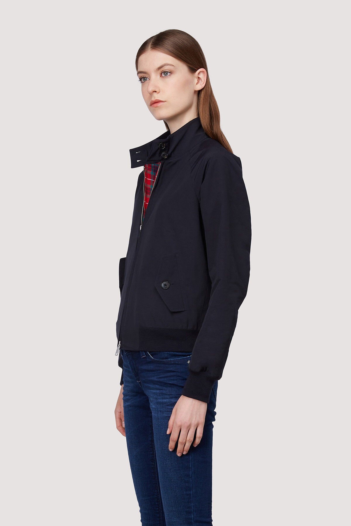 • The Baracuta G9 Woman Slim epitomizes timeless style, offering a distinctive and iconic jacket designed to enhance the contemporary woman's fashion sense. This version, slightly slimmer than other models, maintains signature G9 features such as the Fraser Tartan lining, umbrella back yoke, and dog-ear collar. Whether navigating city streets or exploring the countryside, the G9 Woman Slim is the ideal street style piece - a must-have wardrobe essential for every season.