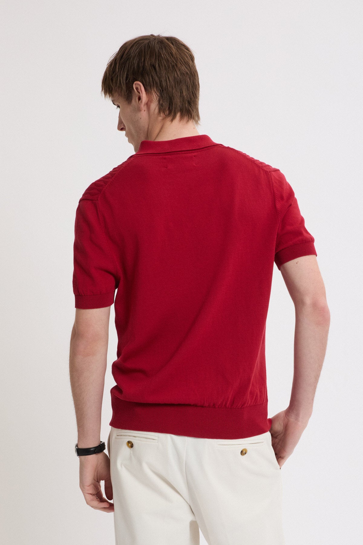 • The Pattern Stitch SS Polo is made from 100% cotton, carefully selected for its durable finish. Cotton provides natural breathability and resilience, making it ideal for everyday wear. The standout feature is the diamond-pattern stitch on the front, a detail achieved through careful knitting.